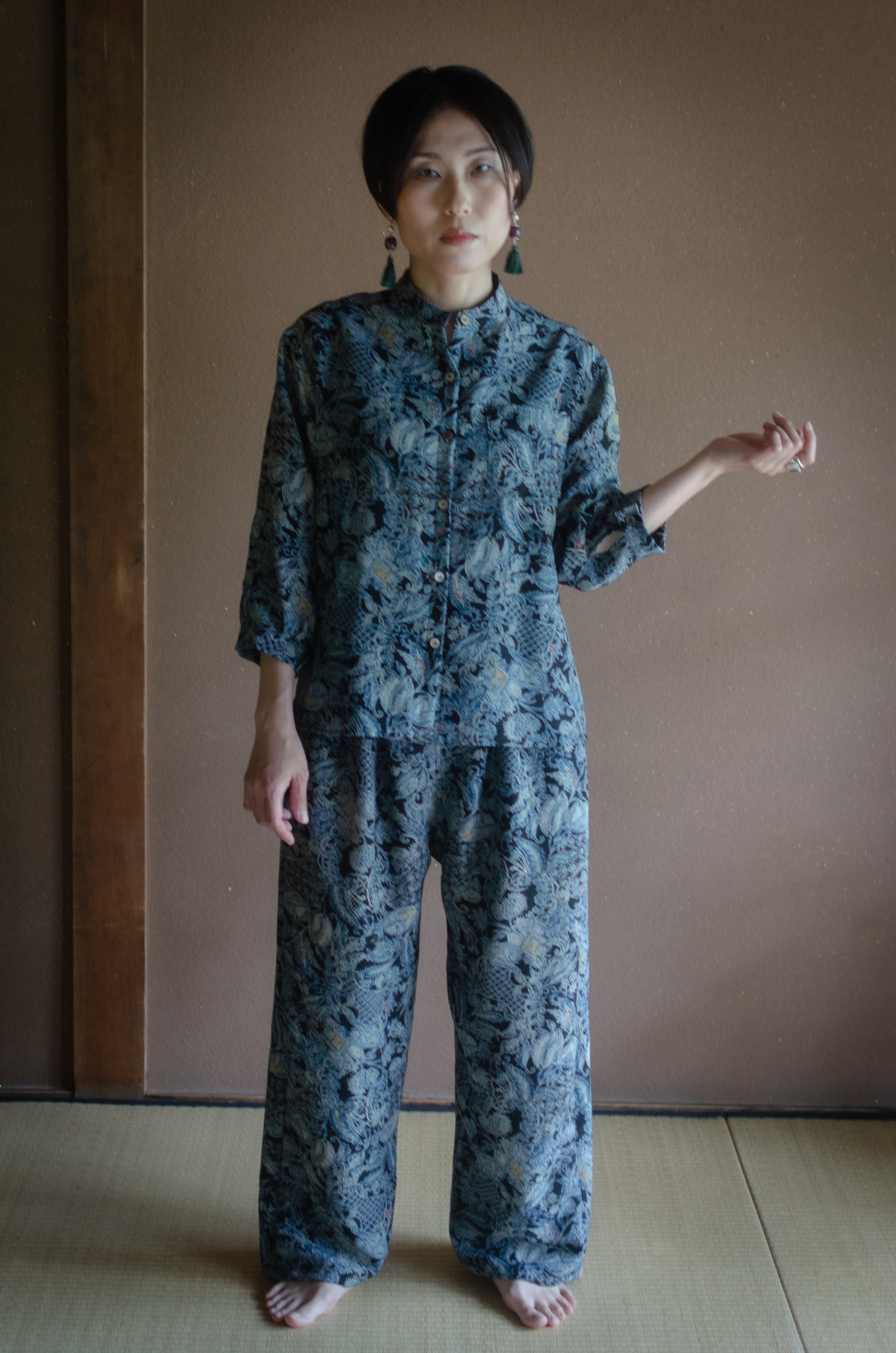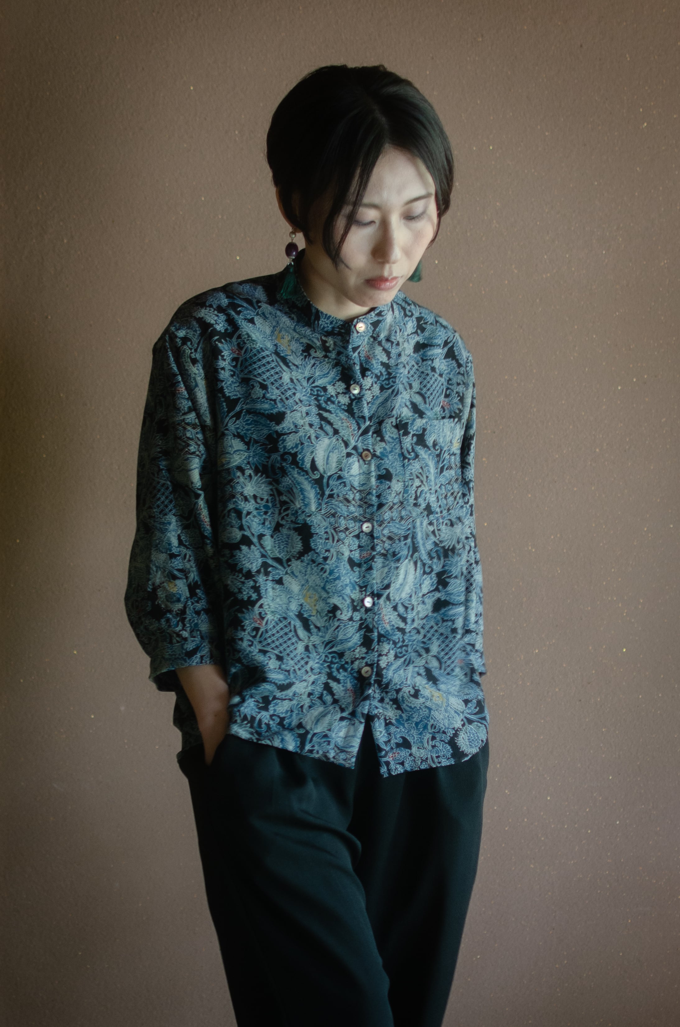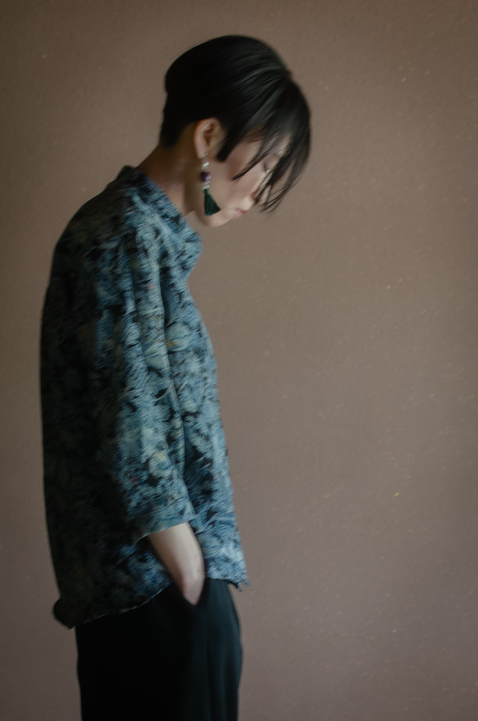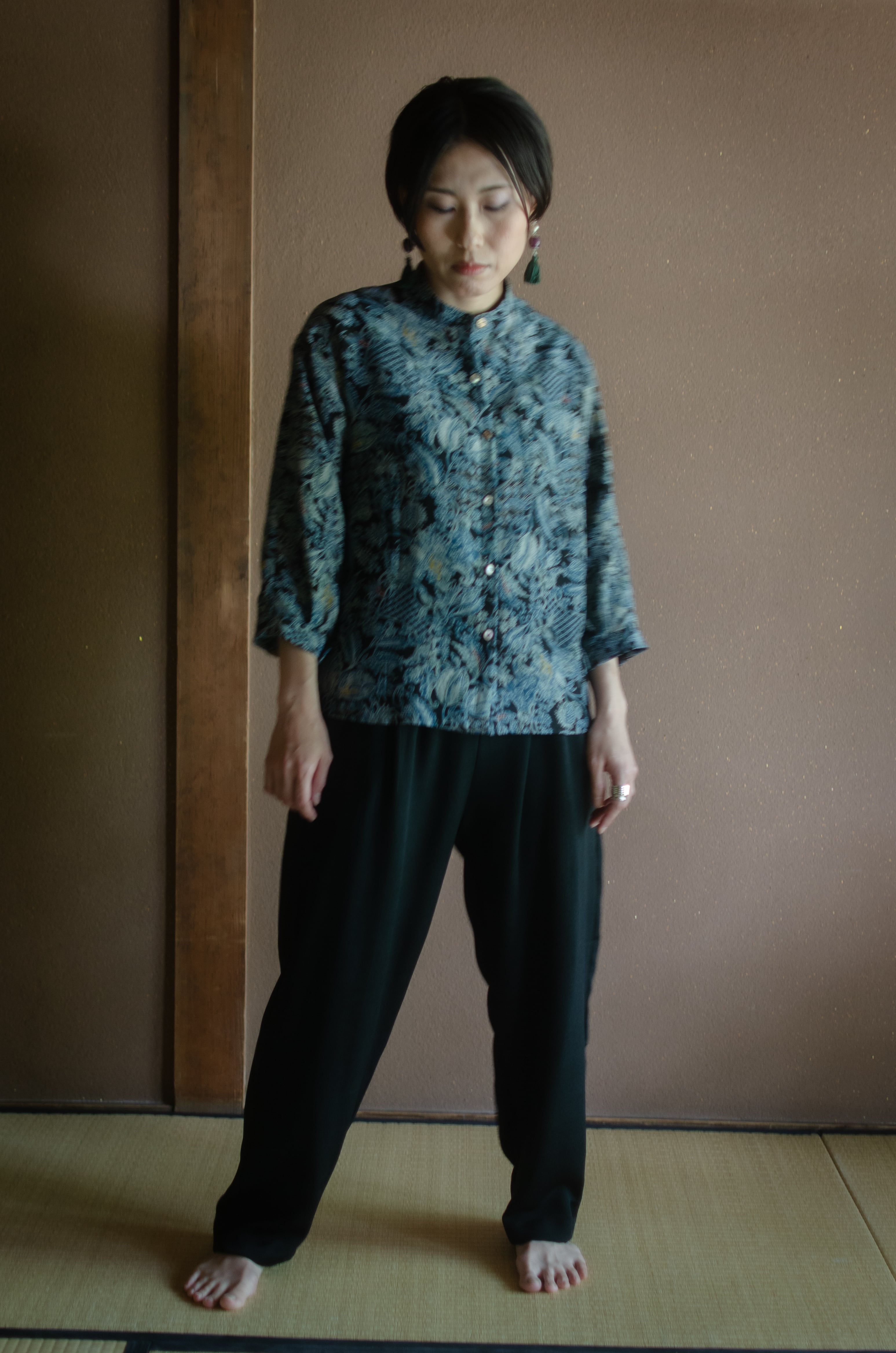 襟ぐりは大きすぎないスタンドカラー。エスニックな雰囲気の一枚になります。